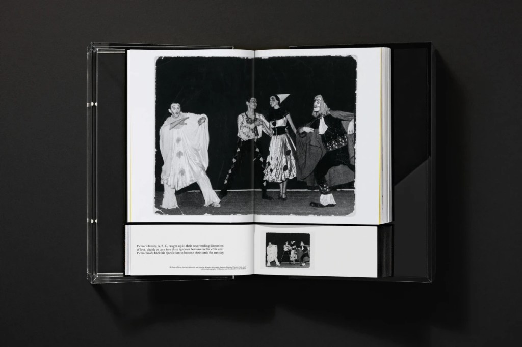 Among the many black-and-white photographs in Jodorowsky’s collection, one shows a wide-eyed teenager with a white-painted face. He is leaning into the arms of a raven-haired woman. “My first pantomime in Chilean theatre,” reads the caption. “Aged 17, made up as an old man of 90, experiencing an orgasm in the arms of death.”
