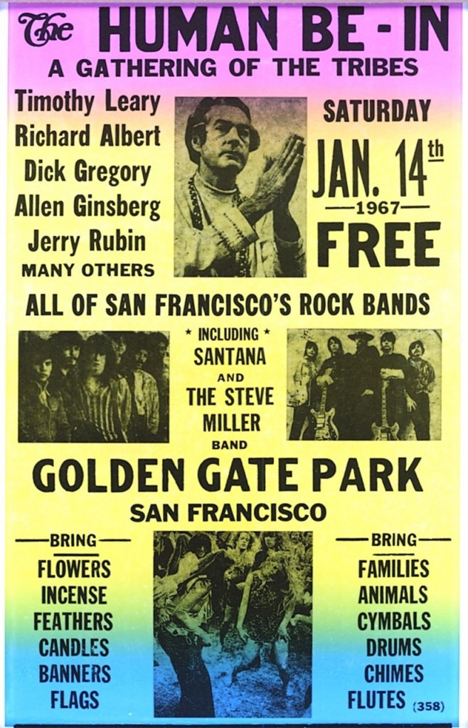 On Saturday, January 14, 1967, the Gathering of the Tribes was held at Golden Gate Park in San Francisco. It was labeled the Human Be-In.