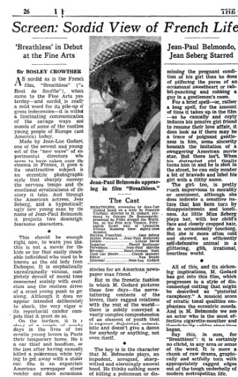 Not everyone agreed this was a good thing. Bosley Crowther was the iconic film critic at the New York Times when Breathless arrived. His review revealed not only his tastes but the general sense of America at that point. John F. Kennedy had been president for about two weeks. Most of America was still culturally conservative, and sensing that something was going on, particularly with some young people on the fringes (or worse, in their own homes). Crowther reflected that in his review, excerpted below:
