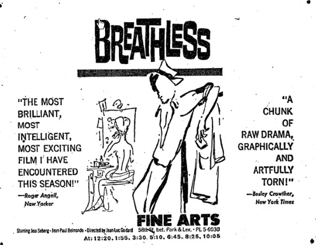 Here I take a different approach. Breathless opened in New York on February 8, 1961. At that point New York had a dozen or more what were called “art houses” where you could see the most recent foreign films. In fact, Breathless opened at a theater called the Fine Arts.