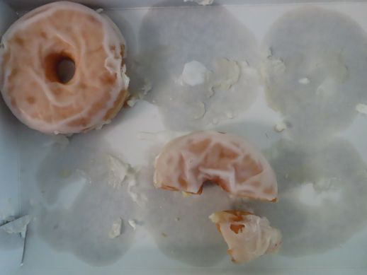 The photo shows one whole donut remaining in the box, along with one-half and one-sixth. There was a request by somebody for one-sixth—a donut bite. So I cut one in half, cut that half into thirds (1/2 x 1/3 = 1/6). Why, you are asking, is there only one-sixth left, when only one-sixth was requested? There is an explanation, but let it remain a mystery for now.