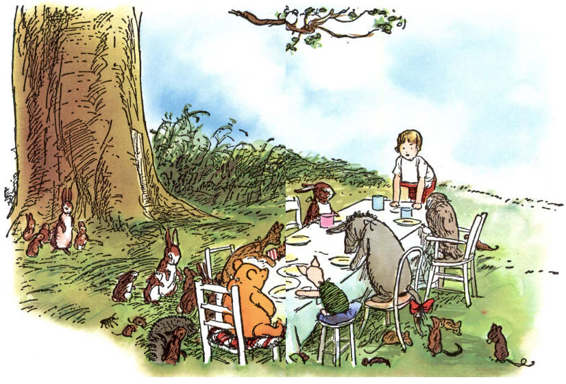 Christopher Robin had made a long table out of some long pieces of wood, and they all sat around it. Christopher Robin sat at one end, and Pooh sat at the other, and between them on one side were Owl and Eeyore and Piglet, and between them on the other side were Rabbit, and Roo and Kanga. And all Rabbit’s friends-and-relations spread themselves about on the grass, and waited hopefully in case anybody spoke to them, or dropped anything, or asked them the time.