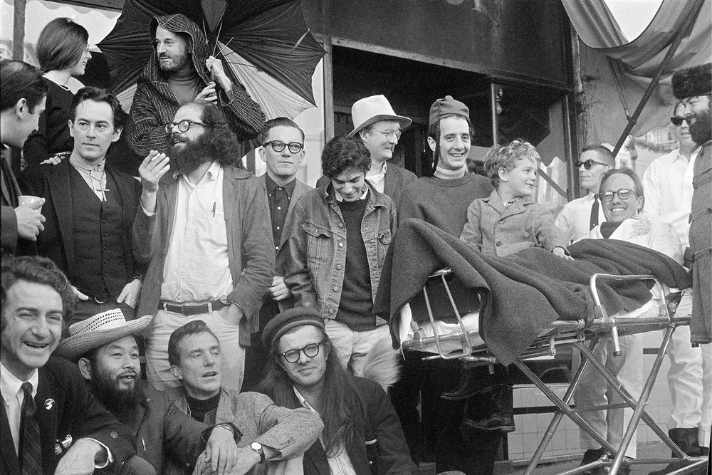 Richard Brautigan: Poet and writer, toward the right, behind the stretcher, light hat and glasses.